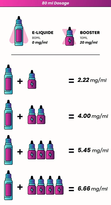 - Il n'est pas recommandé d'ajouter plus de cinq boosters de nicotine à votre e-liquide, car cela pourrait excessivement diluer les arômes, entraînant ainsi une perte notable de leur intensité.