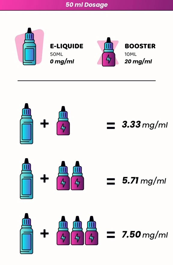 - Il n'est pas recommandé d'ajouter plus de cinq boosters de nicotine à votre e-liquide, car cela pourrait excessivement diluer les arômes, entraînant ainsi une perte notable de leur intensité.