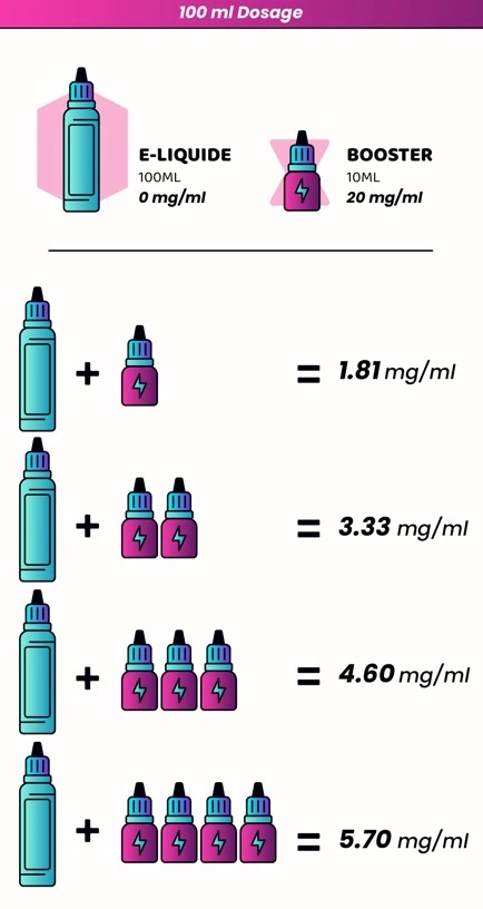 - Il n'est pas recommandé d'ajouter plus de cinq boosters de nicotine à votre e-liquide, car cela pourrait excessivement diluer les arômes, entraînant ainsi une perte notable de leur intensité.