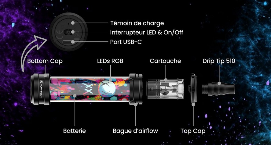 L'utilisation est d'une simplicité déconcertante : l'activation se fait automatiquement par inhalation, et un switch multifonction permet d'allumer ou d'éteindre l'appareil en un clin d'œil. Les effets lumineux RGB intégrés ajoutent une touche esthétique spectaculaire, entièrement désactivables pour une discrétion optimale. Un indicateur de batterie LED tricolore vous informe en temps réel de l'autonomie restante (vert >70%, rouge <30%), pour ne jamais être pris au dépourvu.
