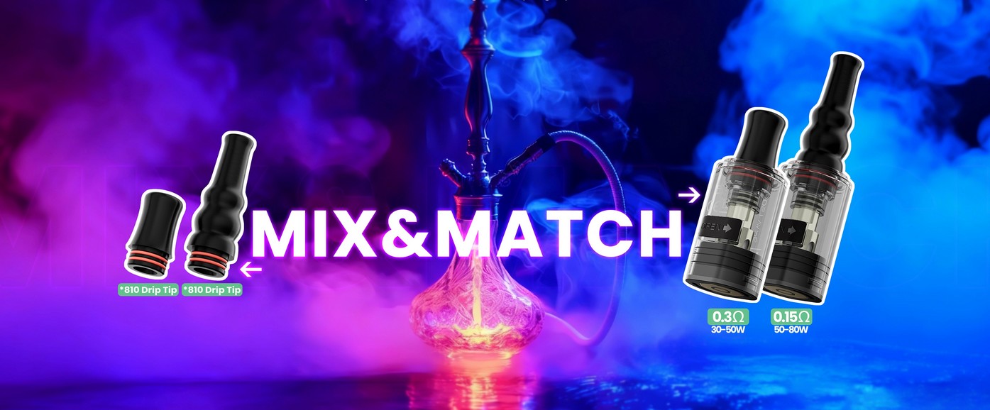 Le kit inclut une résistance de 0.3 ohm (pré-installée, idéale pour 30-50 W) et est compatible avec une résistance de 0.15 ohm (disponible séparément, pour 50-80 W), parfaites pour les e-liquides high-VG. Deux drip-tips 810 interchangeables (court et long) sont fournis pour varier les sensations et imiter au mieux le tirage d''une vraie chicha.