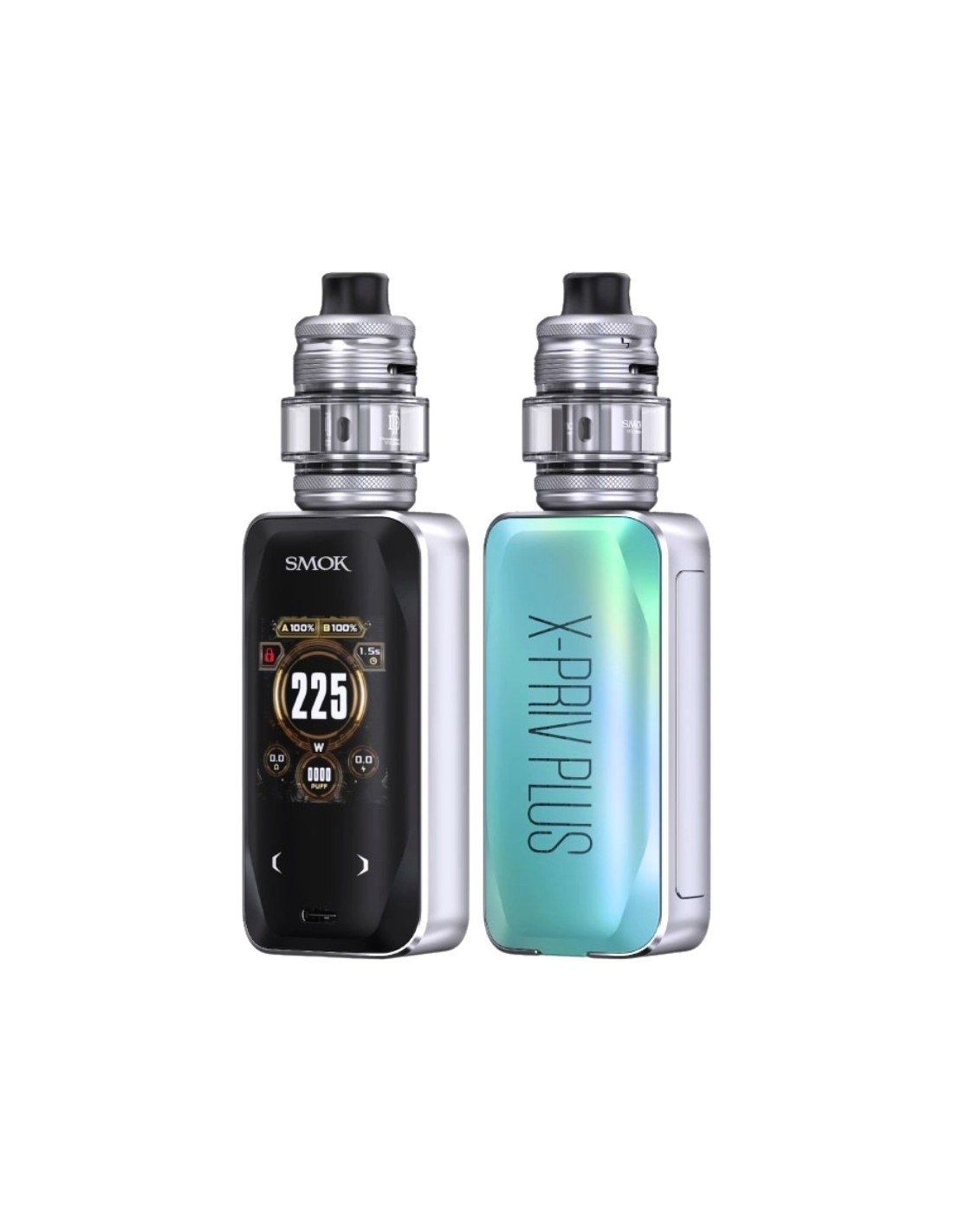 Le kit X-Priv Plus est tout le nouveau modèle de chez Smoktech en double accu 18650 (non fourni). Grâce au 2 accus, vous aurez la possibilité d'avoir jusqu'à 2 jours de vape. Avec son écran TFT couleur tactile, vous pourrez voir l'autonomie restant et régler la puissance qui pourra atteindre les 225W.