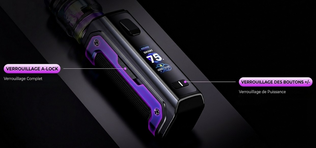 Le switch A-Lock intégré sécurise le transport en verrouillant instantanément l’appareil, évitant toute activation accidentelle. Les boutons +/- disposent également d’un système de verrouillage pour empêcher les changements de puissance involontaires. Fiable et pratique, cette box est pensée pour accompagner les vapoteurs actifs.